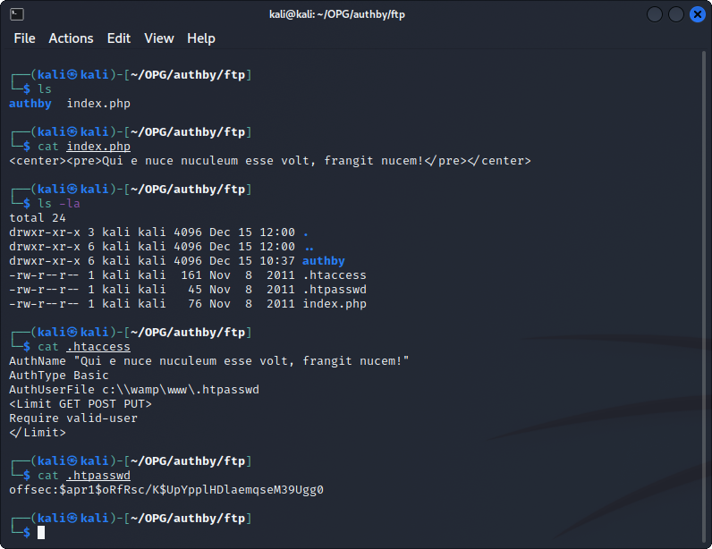 Starting with FTP, we've gotten a fair amount of files we can access, but none of them seem to be that juicy. The only information we can glean from this are some .uac files indicating other FTP users on the machine, offsec, admin, and the account we're using, anonymous. A quick guess at some default credentials in another FTP session reveals the admin user's password is admin. Very nice. In this new session, we find two juicy files: .htaccess and .htpasswd.