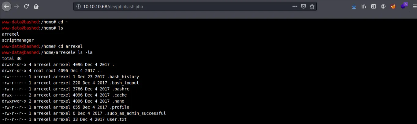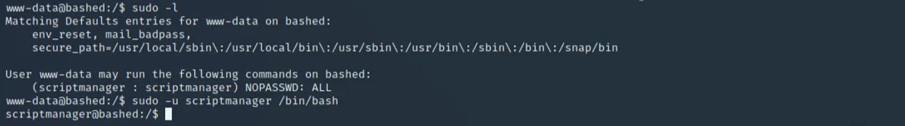 Within this directory are two web shells, giving us remote code execution without doing much other than enumeration. Because there could be limitations with this PHP shell, catching a reverse shell to interact within a terminal could be a safe bet (plus, web shells don't count on the OSCP). Within our reverse shell, we see www-data can run any commands on this machine as scriptmanager.