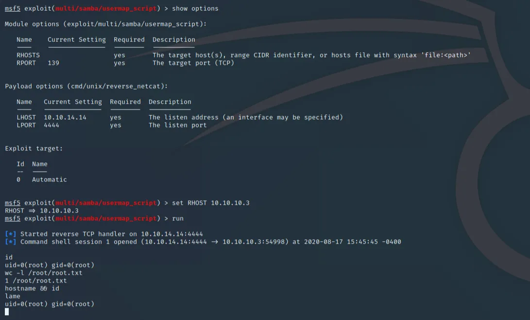 There isn't much more to this exploit than using the MSFConsole, though there are manual exploits floating around on Exploit-DB and on Github repositories. At the time of writing, however, some of the manual exploits were not working due to an upgrade to Python3 and a deprecated smb.Connection module. Opening Metasploit, it's as close to point and shoot as possible; we are greeted with root privileges immediately after running exploit: