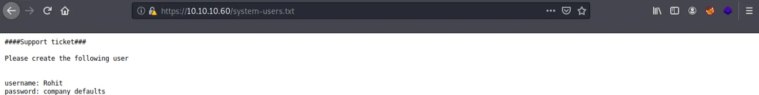 While there's almost an overload of directories discovered, two items stick out the most: /changelog.txt and /system-users.txt. Accessing /system-users.txt shows the following support ticket detailing the need for a user to be created with a credential set of "rohit" and company defaults: