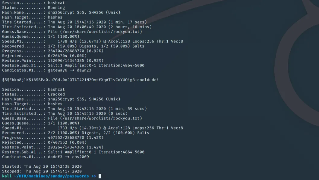 With this information, we can use hashcat on our local machine to crack these passwords against the rockyou.txt dictionary relatively quickly by using the following command: