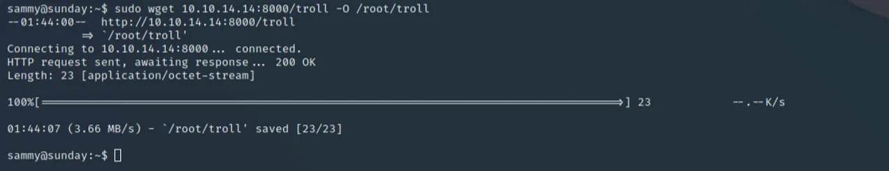 Now that we have a credential set of sammy:cooldude!, we can SSH into the machine (which is highly recommended for the next method). When a connection is established, the same "sudo -l" command shows we have access to wget, leading us down the path of creating our own troll file, using wget with sammy to place it into /root, and executing it with the sunny user. On our local machine, we can create our own troll file with the following contents: