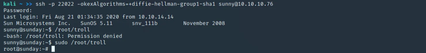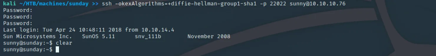 After some time, we notice two users that stick out to us: sammy and sunny. Armed with this information, the only other port that appears to be open for us to test against is SSH. Performing brute forcing against SSH will eventually show a password of "sunday" for the sunny user (I would include this, but it took 4 tries over 2 days to get this and I was not in the mood to capture a PoC). When trying to SSH to verify this claim, we get an error about specific key exchanges not being supported. After making the appropriate changes we are greeted with the following:
