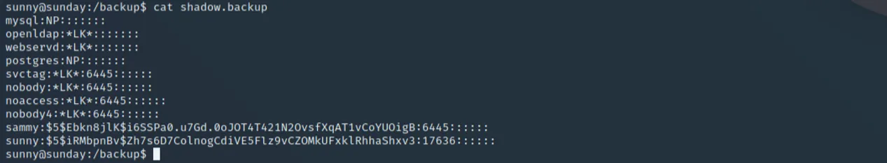 Moving to other parts of the box, we notice a non-standard directory called /backup, containing two files, with one of them named shadow.backup. If we cat this file, we are greeted with the following: